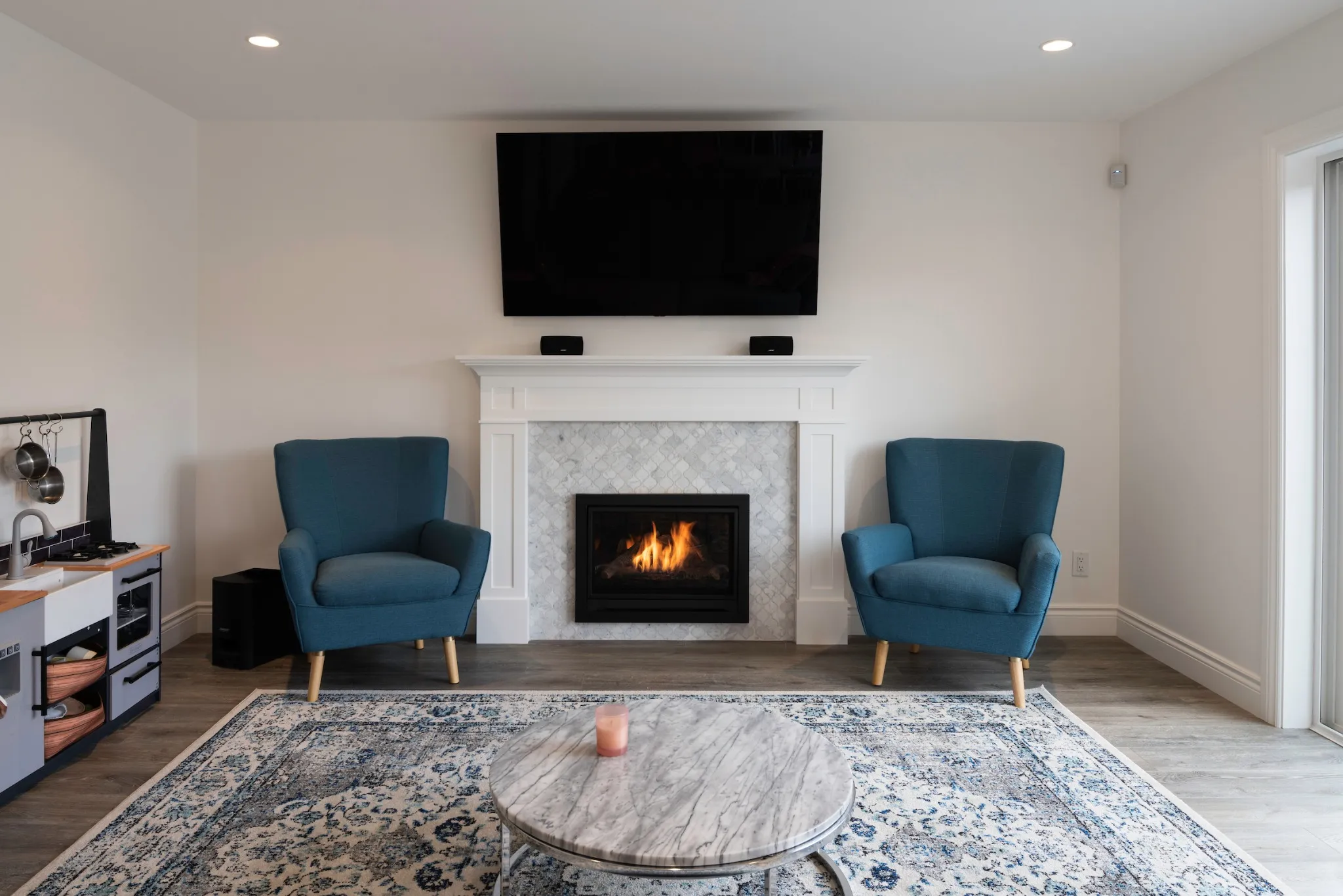 The renovation introduced state-of-the-art fireplace inserts and an expansive open concept area, seamlessly integrating the kitchen, dining, and family rooms.