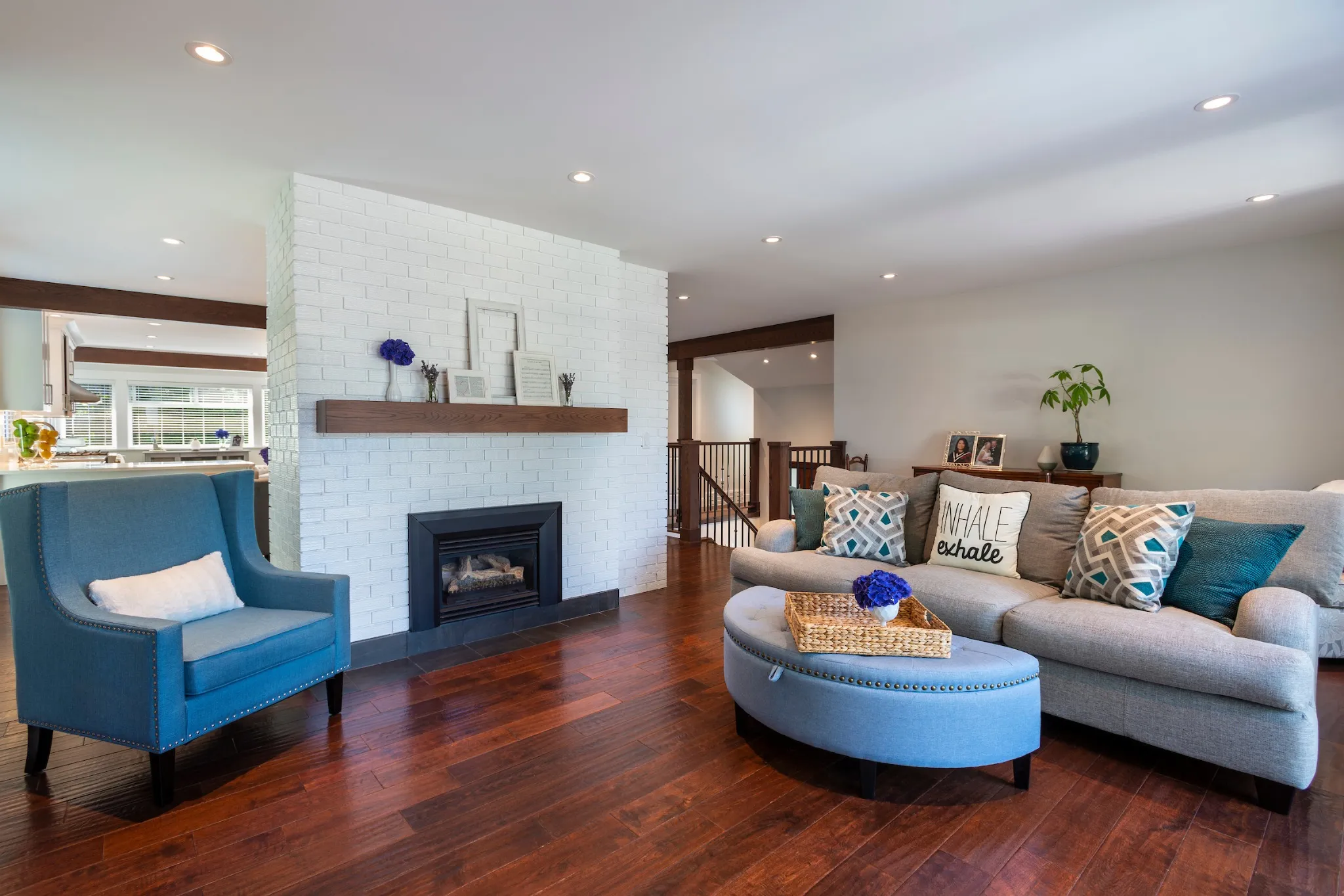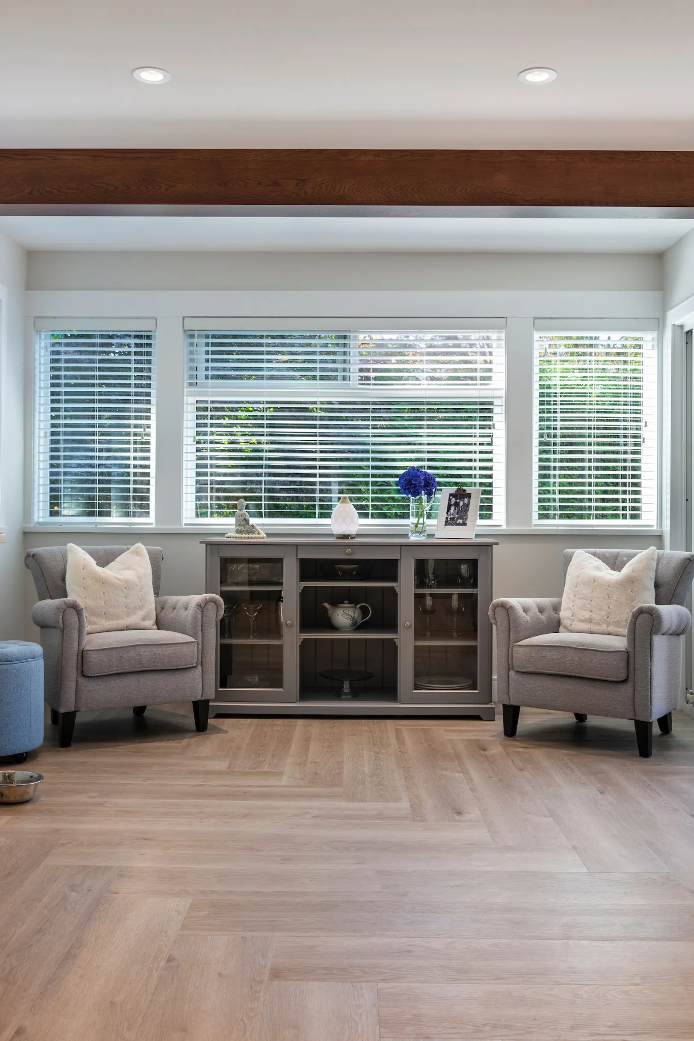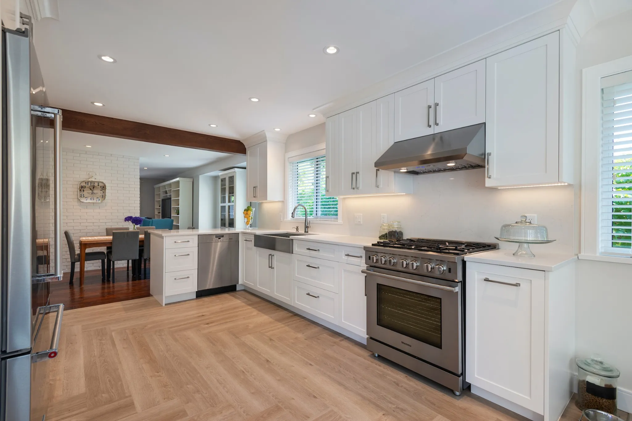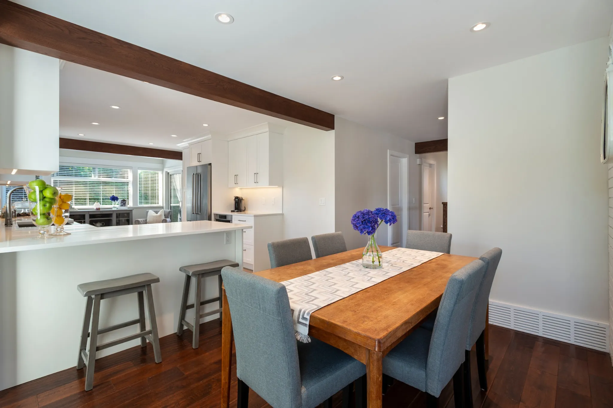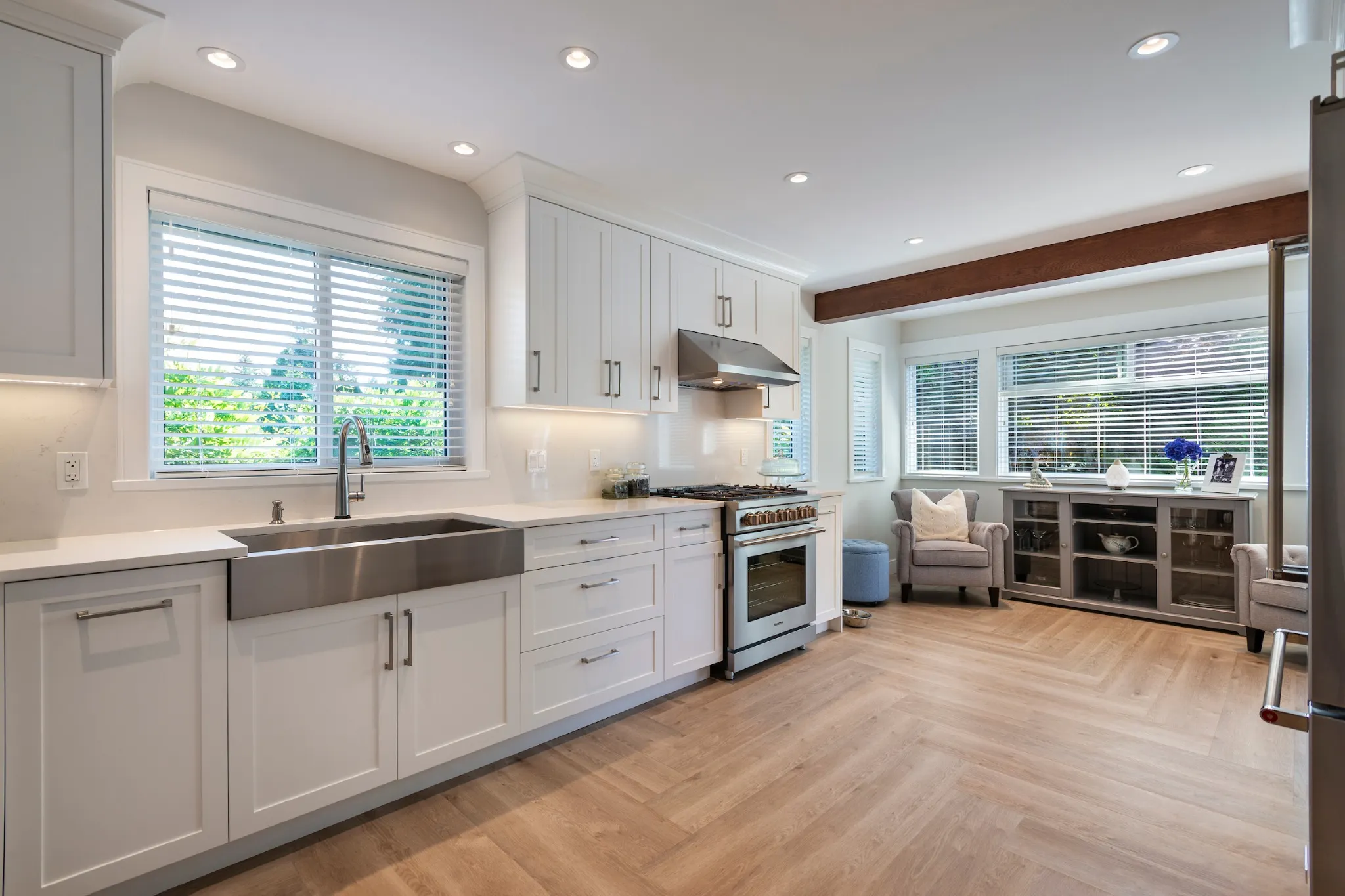 WH Delwood showcases a complete kitchen renovation with top-tier materials and design, updates to the main floor’s trim, and a new deck that extends the kitchen space outdoors. Additional enhancements include sophisticated new flooring and modern window casings.