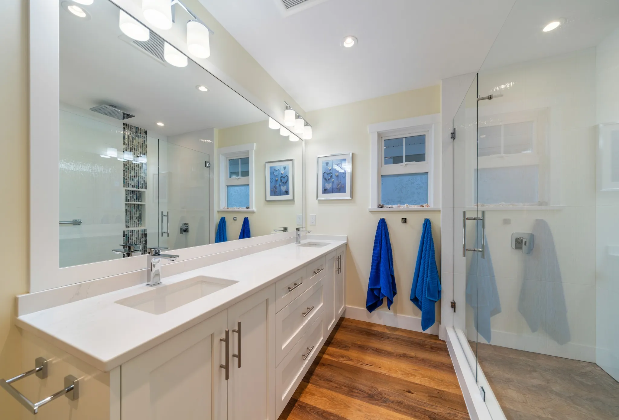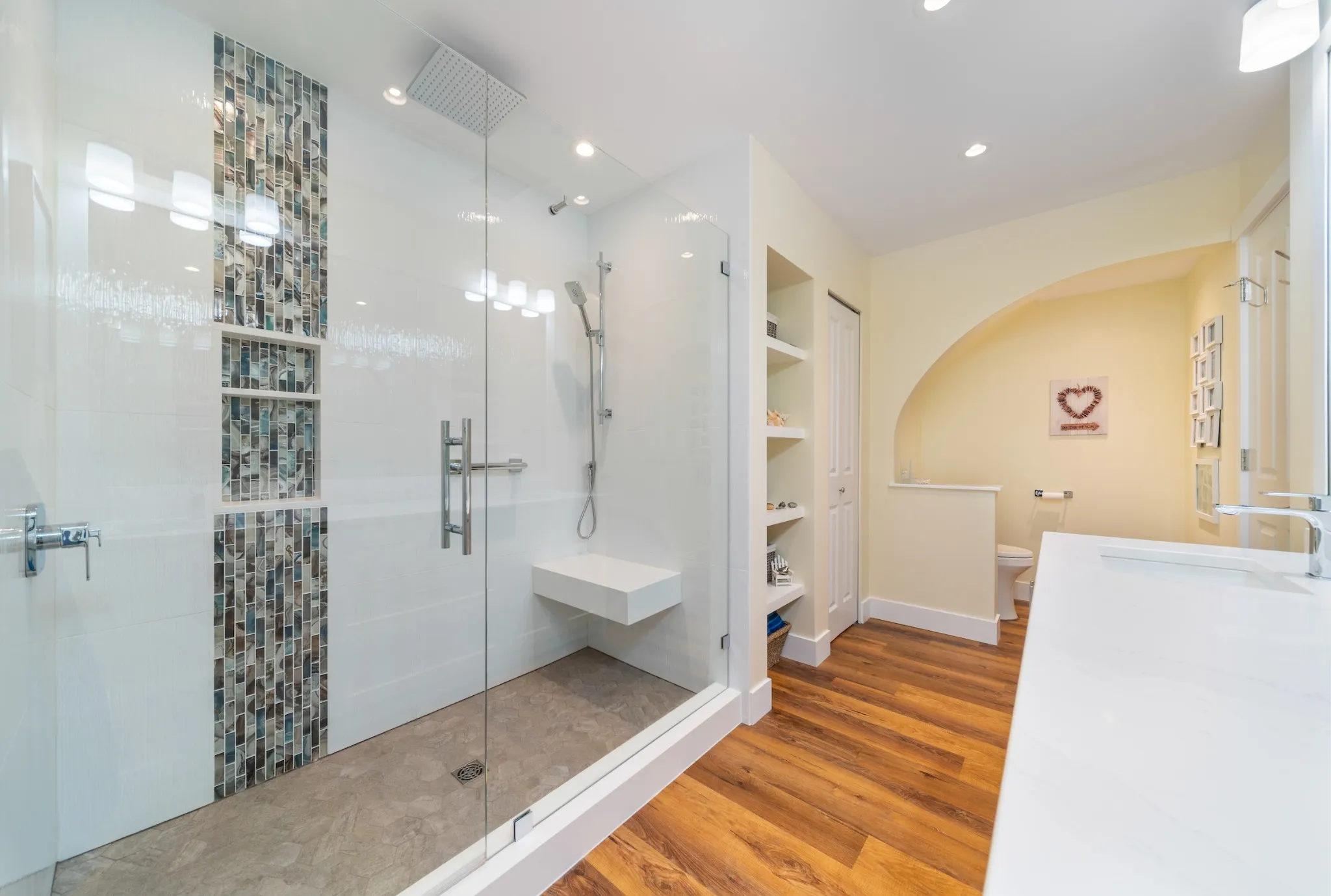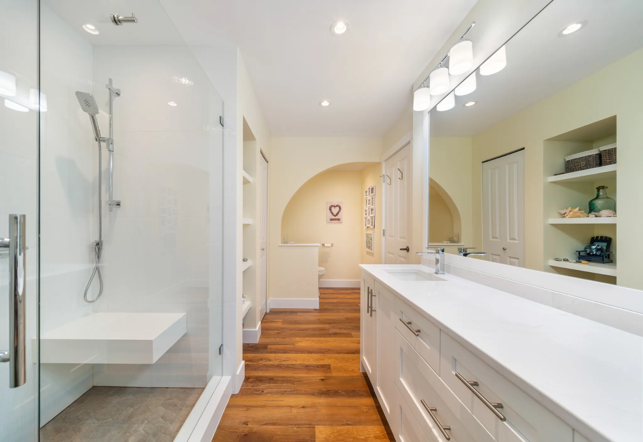 This bathroom renovation focuses on spatial optimization and modern luxury, featuring a custom-designed shower, updated vanity, and cohesive aesthetic enhancements.